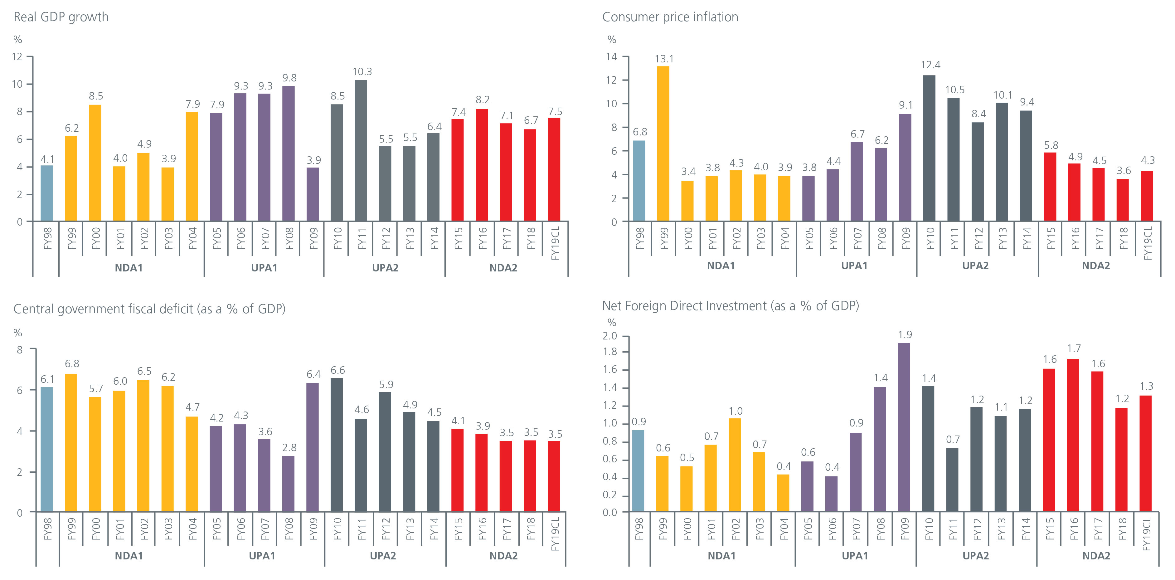 In the lead up to the polls, the probability of BJP repeating its 2014 single party majority feat had been considered low, given the economic performance under Prime Minister Modi’s leadership. Over the last 5 years, BJP has delivered on some of the 50 key promises/reforms. There are still a number outstanding; key among these being the insufficient creation of jobs, weak manufacturing, shortfall in investments and low farm incomes. Equally, the party’s execution record is seen to be weak given the implementation issues around the demonetisation and Goods and Services Tax (GST) schemes. Having said that, there have been several landmark achievements that have been underappreciated. Rural electrification, direct benefit transfers for subsidies, construction of toilets across villages for improving sanitation and hygiene, LPG cooking gas (almost for all) and increasing the road network pan India have been very well received by the rural poor. Last but not the least, reining in inflation for food and protein has been the biggest scoring point.