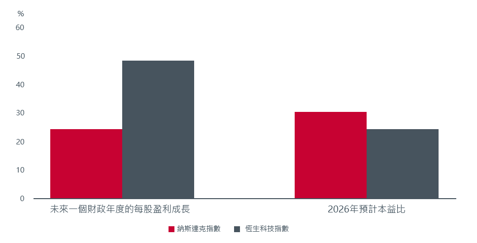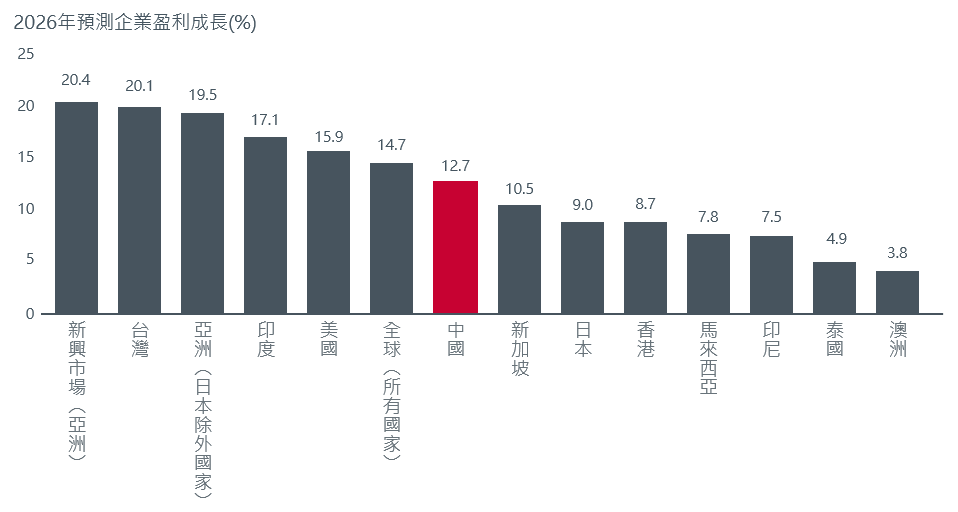 資料來源︰LSEG Datastream、Institutional Brokers' Estimate System(IBES)、MSCI;截至2025年12月31日。數據代表根據相應日曆年的每股盈利的預測加權按年成長計算。