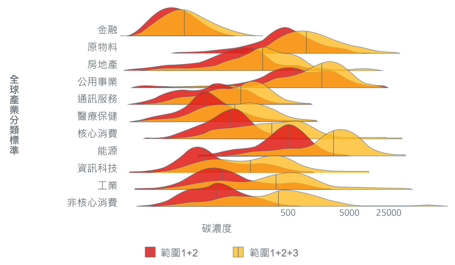 如圖所示,公用事業及原物料產業排放的溫室氣體中,以範圍1的比重最大;而核心及非核心消費等以生產為主的產業,由於價值鏈複雜,以範圍3的排放為主。