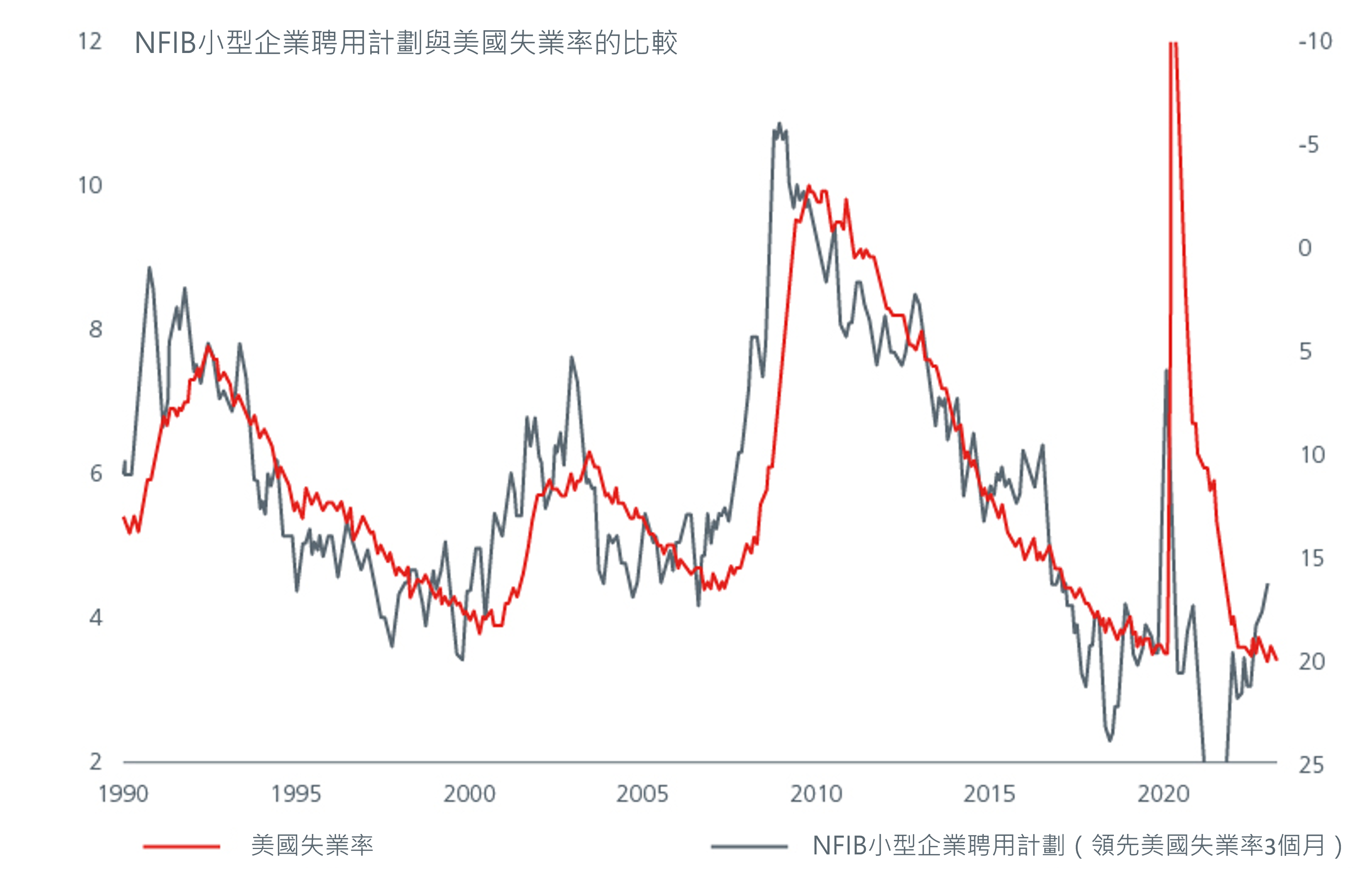圖3. NFIB 小型企業員工聘用計畫的規模萎縮,顯示失業率即將上升