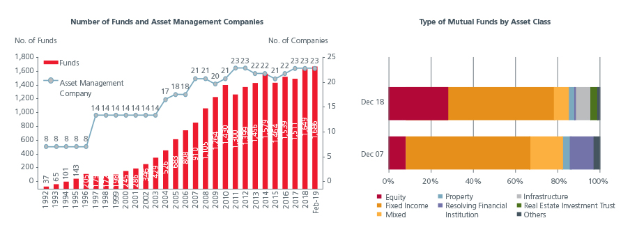 The number of asset management companies operating in Thailand has more than doubled since the early 90s while the number of mutual funds has seen a colossal growth. About half of the asset management companies in Thailand are either wholly or partially owned by banks and manage around 92% of the industry’s total assets under management.10