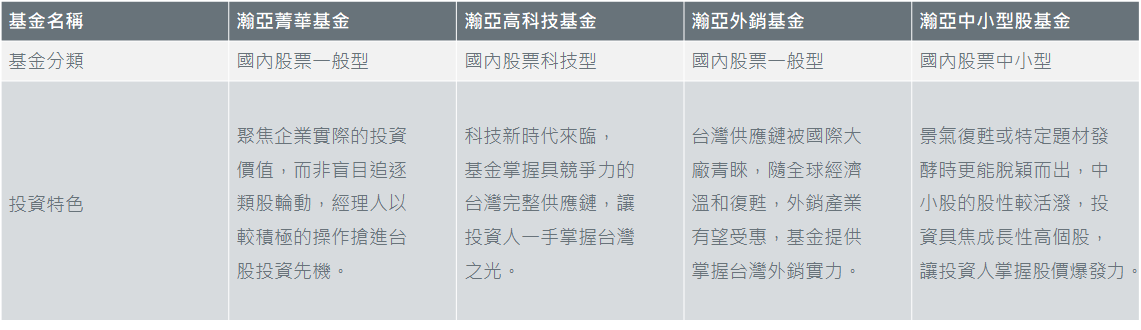 資料來源:瀚亞投信,2024/06。表:瀚亞台股系列基金投資特色